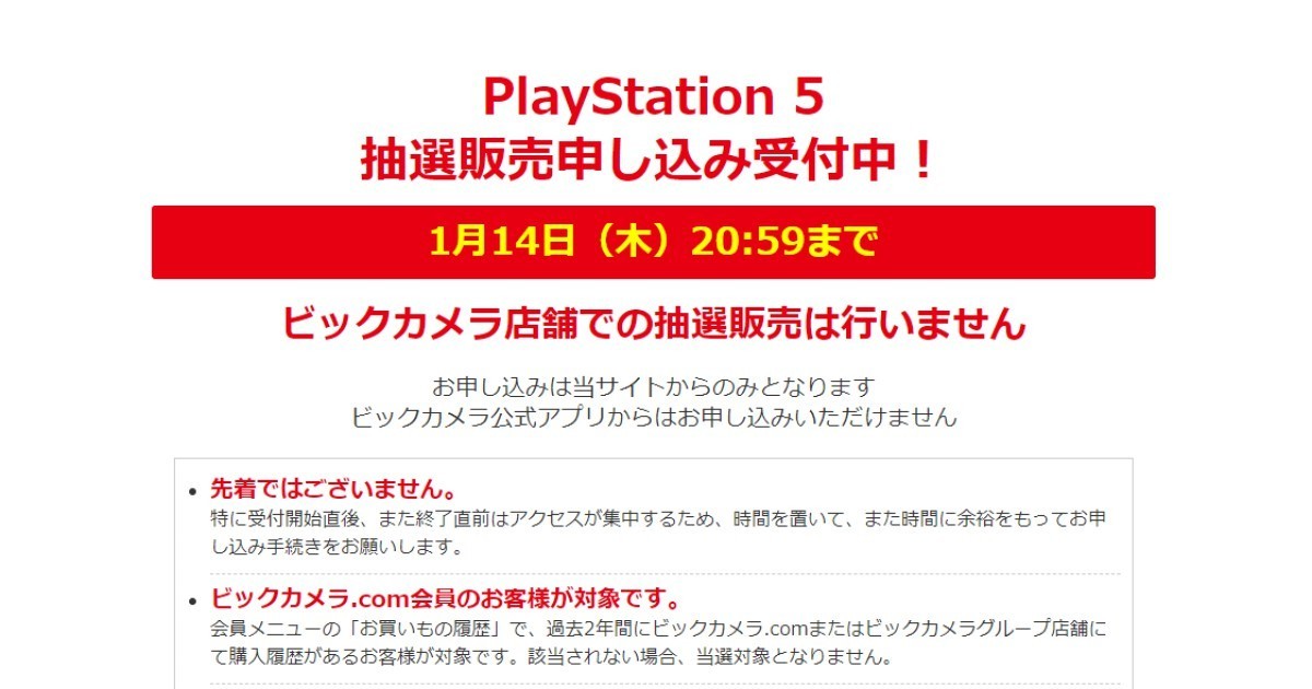 1月14日20時59分まで ビックカメラ Com会員限定でps5の抽選販売 ニコニコニュース