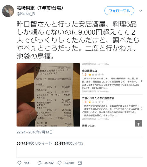 池袋のプチボッタクリ店が酷い 料理3品しか頼んでいないのに9000円を超える料金 数年前から有名なぼったくり店だった ニコニコニュース